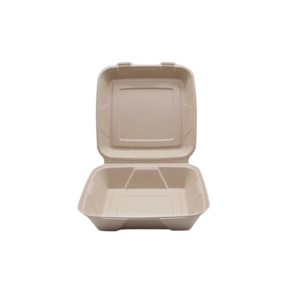 8″×8″ hinged lid containers are made from natural molded fiber, wihch is 100% biogradable and compostable. The natural color is reflective of the improved reformulation. It will naturally decompose in organic soil, leaving no harmful residue behind within 6 months. Clamshell structure, microwave and freezer safe.