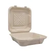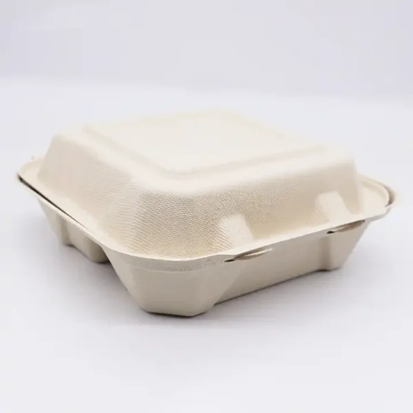 8″×8″ hinged lid containers are made from natural molded fiber, wihch is 100% biogradable and compostable. The natural color is reflective of the improved reformulation. The design has also been improved to strengthen the product for greater rigidity, improved stacking, and allow for greater case-pack efficiency. It will naturally decompose in organic soil, leaving no harmful residue behind within 6 months. Clamshell structure, microwave and freezer safe.