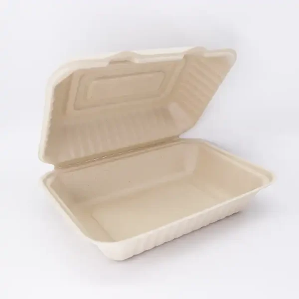 9″×6″ hinged lid containers are made from natural molded fiber, wihch is 100% biogradable and compostable. The natural color is reflective of the improved reformulation. The design has also been improved to strengthen the product for greater rigidity, improved stacking, and allow for greater case-pack efficiency. It will naturally decompose in organic soil, leaving no harmful residue behind within 6 months. Clamshell structure, microwave and freezer safe.